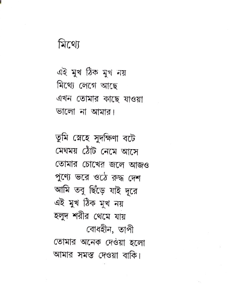 Sankha Ghosh was a master wordplayer. He could hide the obvious in broad daylight. I have tried to capture that direct yet elusive quality of his writing. I will not do the reading for you. But I will say this much: the word that I agonized over the most was তাপী. In Bangla, it has a direct connotation in conjunction with the word পাপী which means ‘sinner’. Yet তাপী also has the sense of being feverish, hot from within. I strove to choose a word that can straddle all these meanings. I am not sure to have succeeded though. Over to you, then.