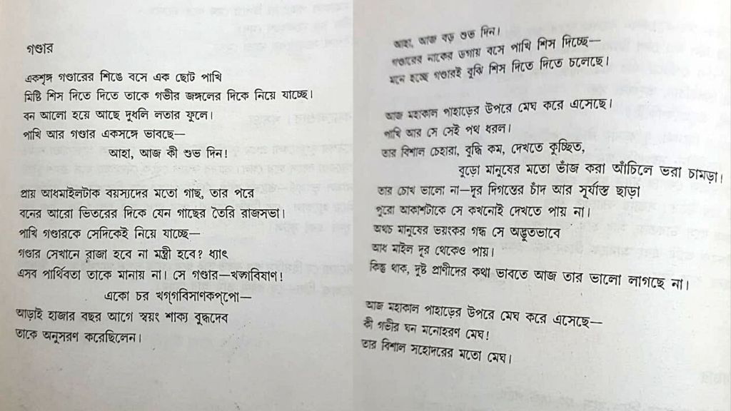 ‘গণ্ডার’ or ‘Rhinoceros’ is my favourite poem by him. Why, I cannot tell you. I have gone through a significant amount of his writing, both poetry and prose. But I always come back to this, and leave with a smile. Here, let me share this with you.